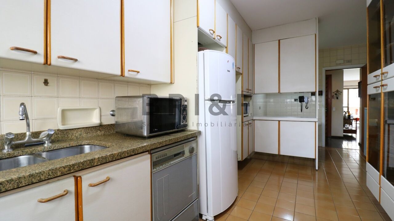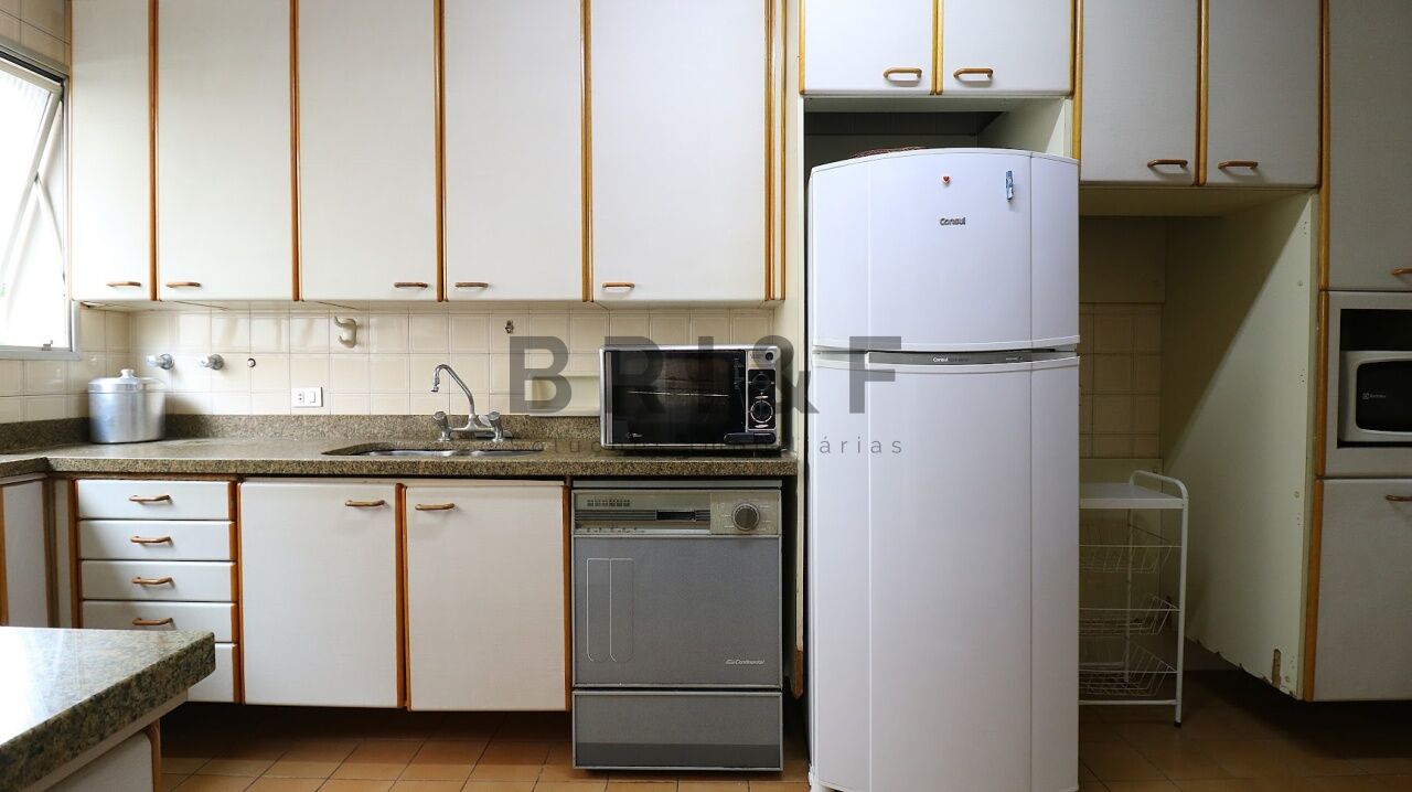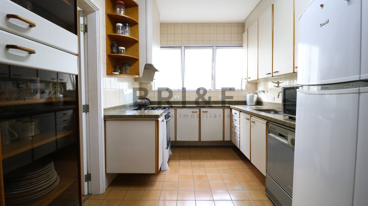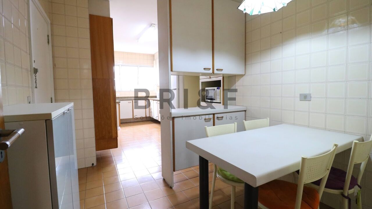 Ampla cozinha com armários planejados e área de serviço com quarto de empregada, banho e lavanderia.