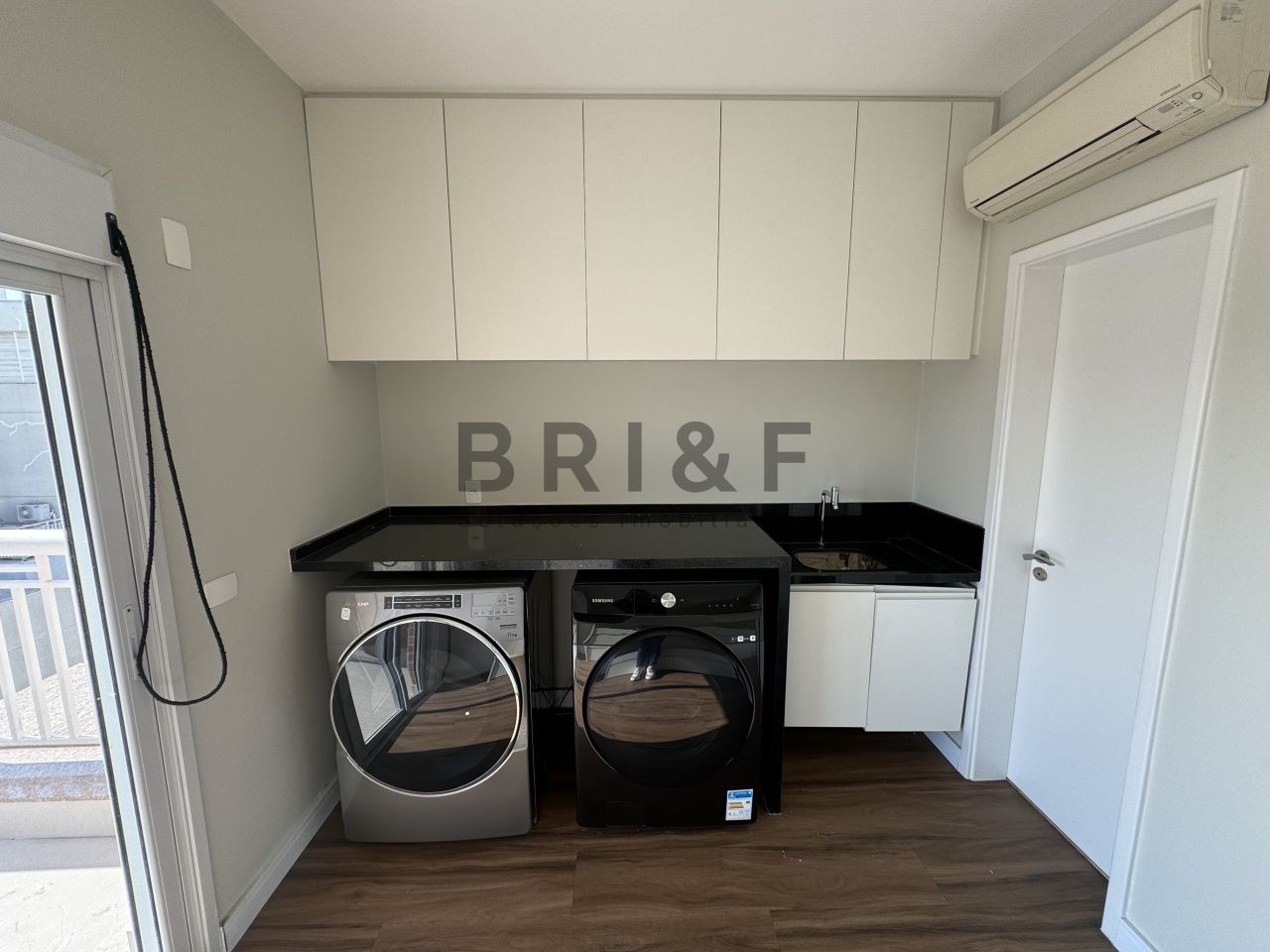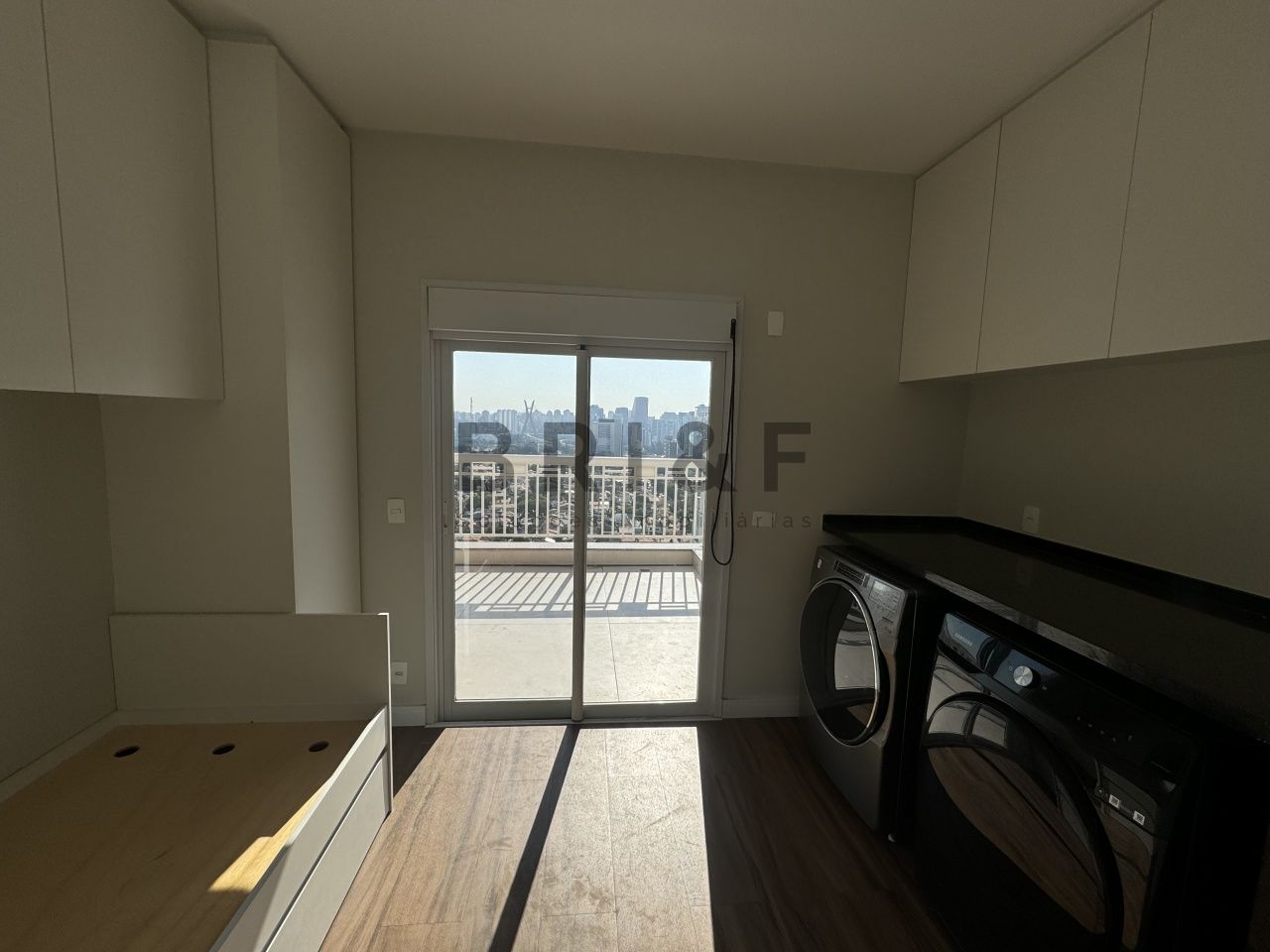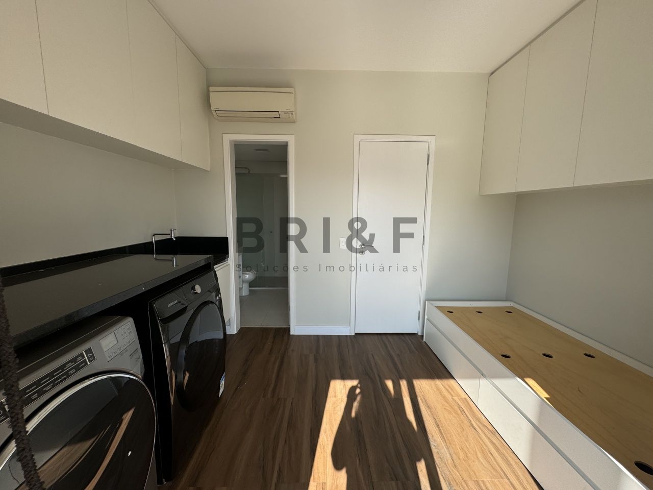 Uma suíte simples adaptada para dormitório de serviço e lavanderia, com máquinas de lavar e secar.