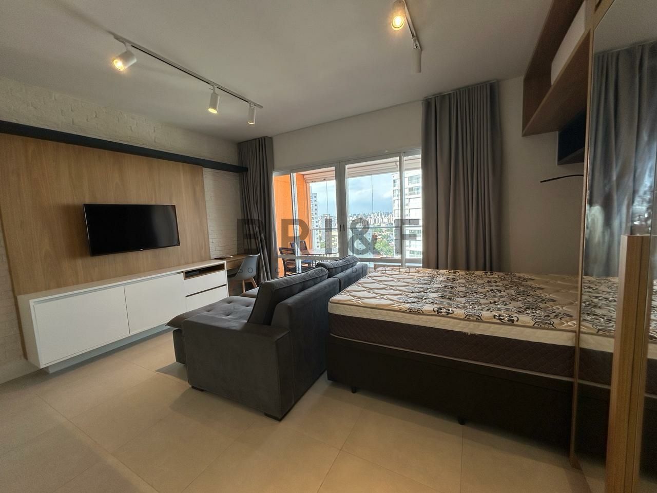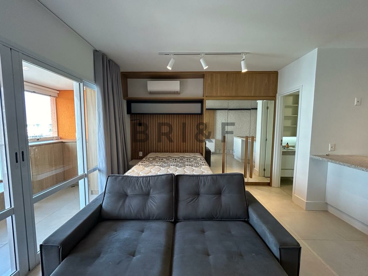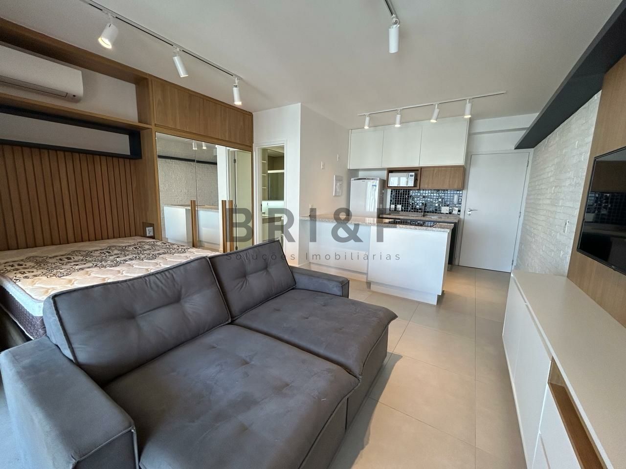 Marcenaria e eletrodomésticos novos, dormitório com cama, ar condicionado na sala, sofá , mesa de apoio para home office.