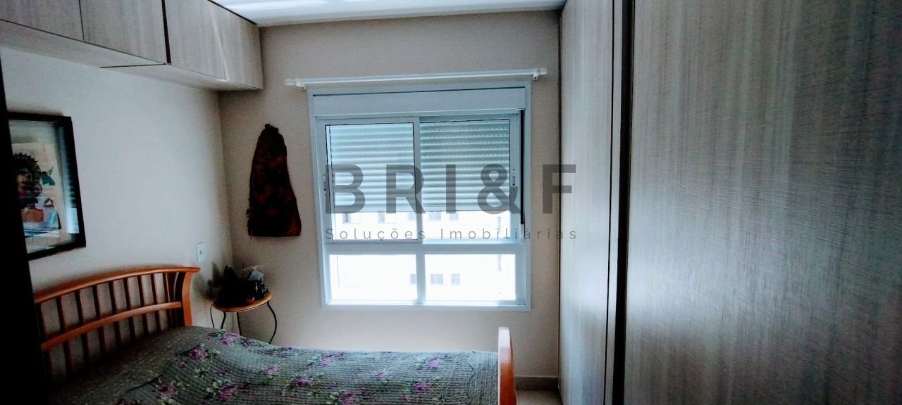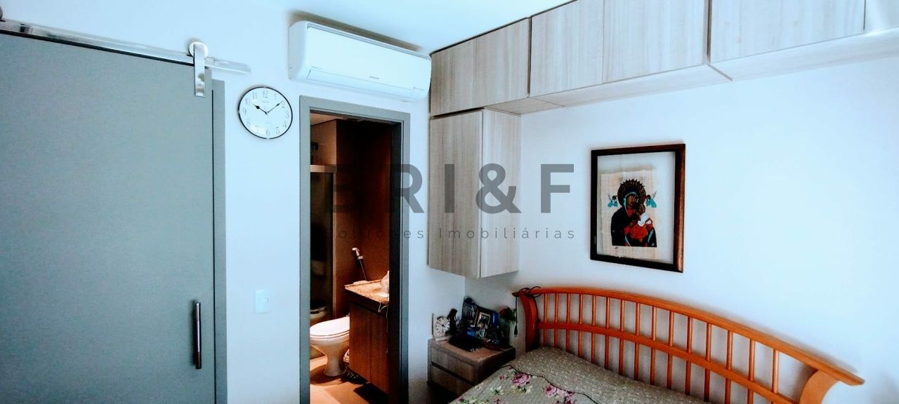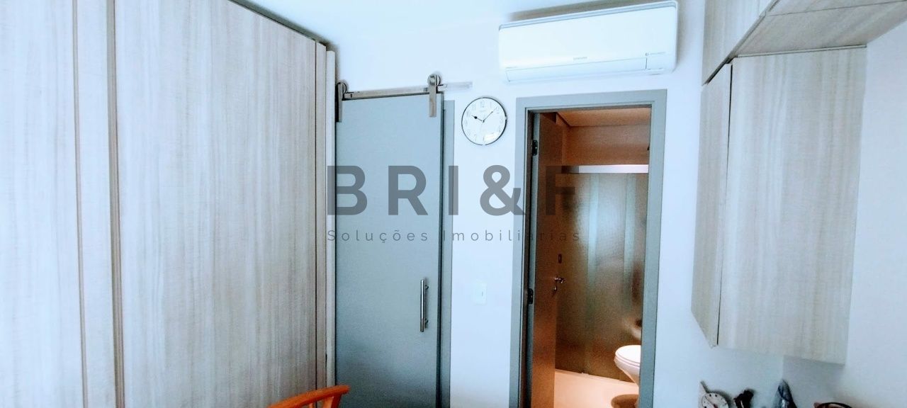Um dormitório suíte, com armários planejados, ar condicionado.
