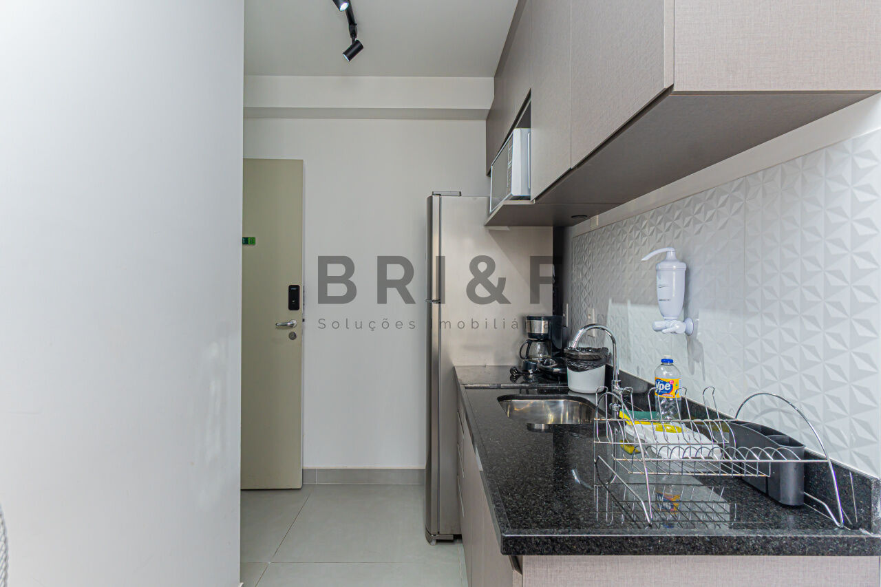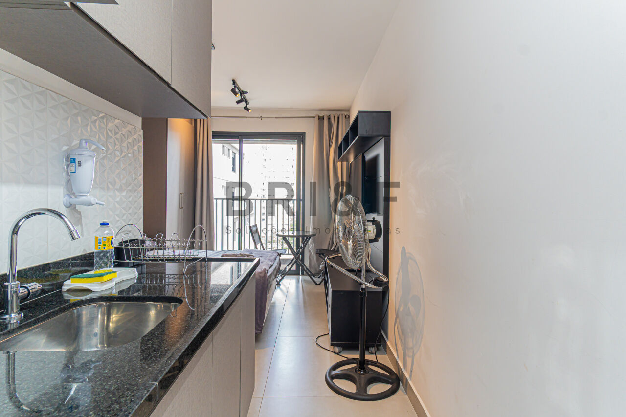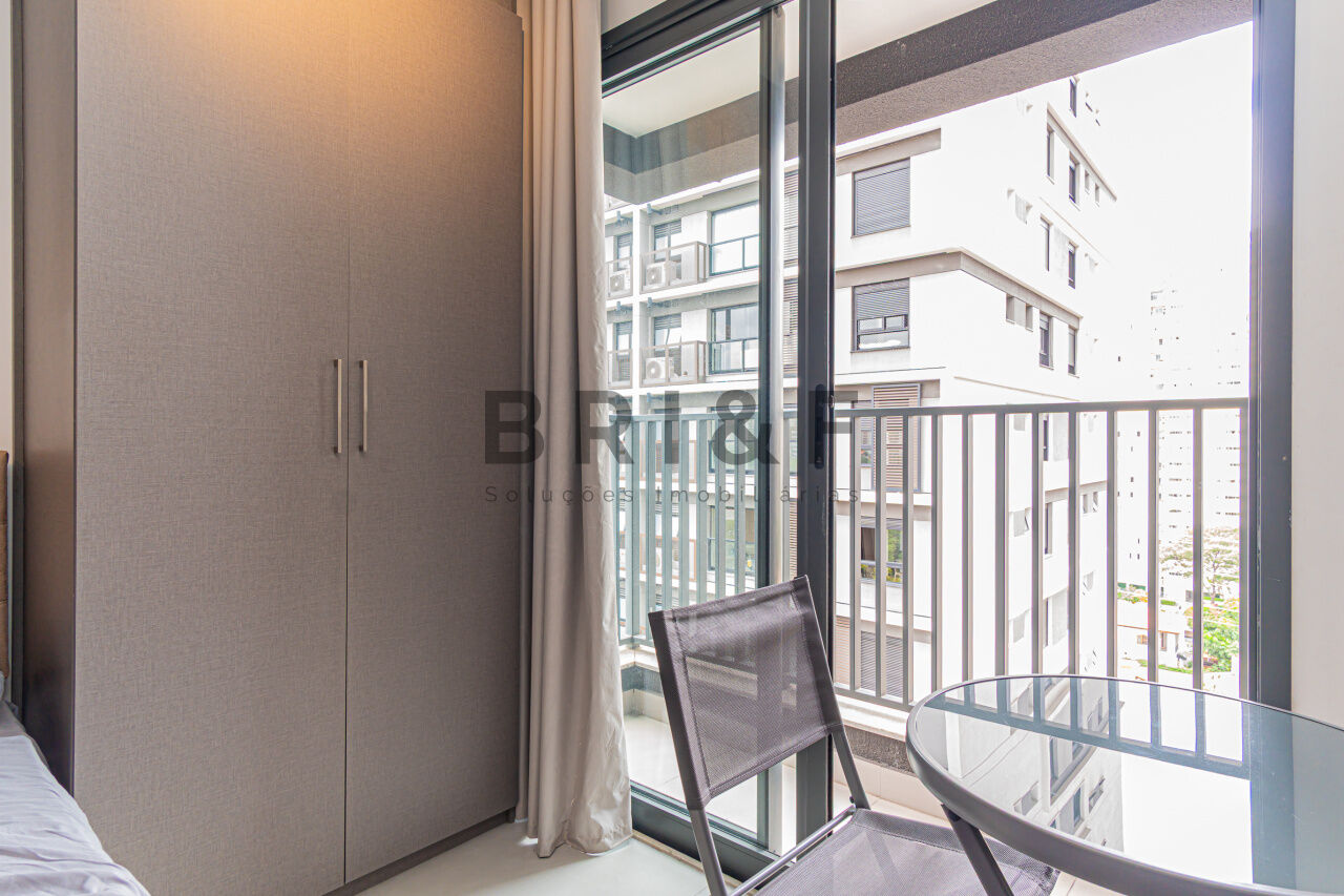 APARTAMENTO STUDIO, 25 M² 1 DORMITÓRIO NO BROOKLIN, mobiliado, com geladeira, cooktop, cama, armários planejados, televisão, micro-ondas, ducha, box, andar alto.